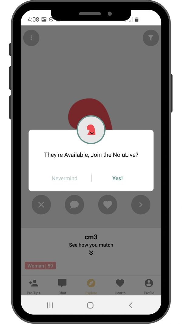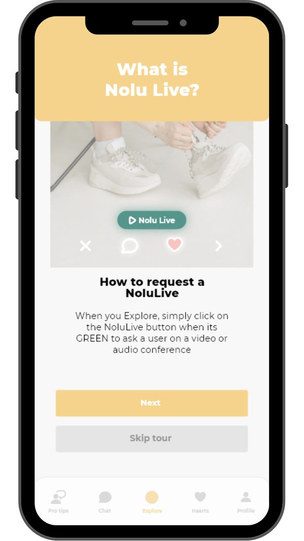 To find each other easily, first send a text message to the user who will be in the chat box. You can then request NoluLive directly from the chat conversation with the user. Alternatively, it is possible to request a NoluLive call from the screen in EXPLORE, when the action button is GREEN.